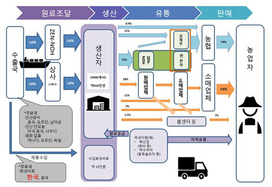 한국으로부터의 비료 수입구조는 화학비료의 경우 젠노가 일괄 구입 후 각 농협을 통해 전국 농업종사자에 판매, 상사 또는 OEM으로 수입해 홈센터 및 소매업자가 판매하는 경우가 일반적이다.