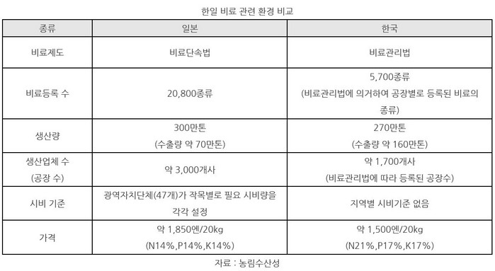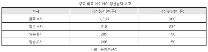 비료등록 수에서 크게 차이를 보이고 있다. 일본은 2만800종류인 반면, 우리나라는 5700종류에 불과하다. 생산업체(공장 수) 일본은 약 3000개사, 우리나라는 약 1700개사다.