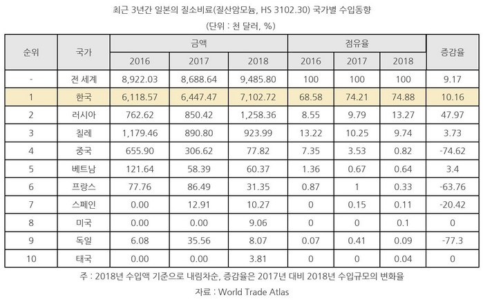 일본의 질소비료(HS 3102.30) 국가별 수입통계를 보면, 2018년 기준 전 세계로부터 약 948만 달러 규모를 수입해 전년 대비 9.17% 늘었다. 수입국 중 1위는 한국으로 710만 달러 규모를 기록해 전년 대비 10.2% 수입액이 증가했다. 점유율도 3년간 꾸준히 올라 2018년 기준 일본의 질소비료 전체 수입의 4분의 3을 차지하고 있다.