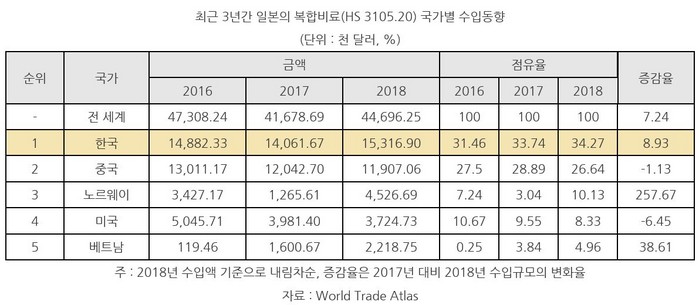 화학비료 원료 2가지 이상을 섞어 만든 복합비료(HS 3105.20) 또한 한국이 점유율 선두다. 일본의 복합비료 총 수입액은 2018년 기준 약 4469만 달러 규모로 전년 대비 7% 성장했다.