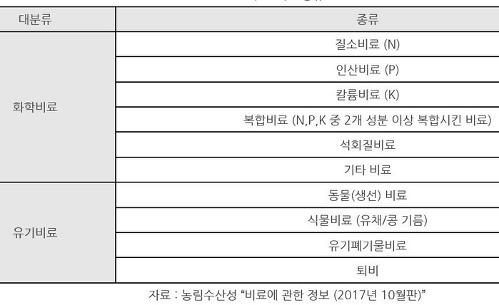 화학비료 3대 요소중 2종류 이상 포함한 것은 복합비료로 따로 구분된다. 비료 종류는 질소비료 (N), 인산비료 (P), 칼륨비료 (K), 복합비료 (N,P,K 중 2개 성분 이상 복합시킨 비료), 석회질비료, 기타 비료, 유기비료, 동물(생선) 비료, 식물비료 (유채/콩 기름), 유기폐기물비료, 퇴비로 구분된다.