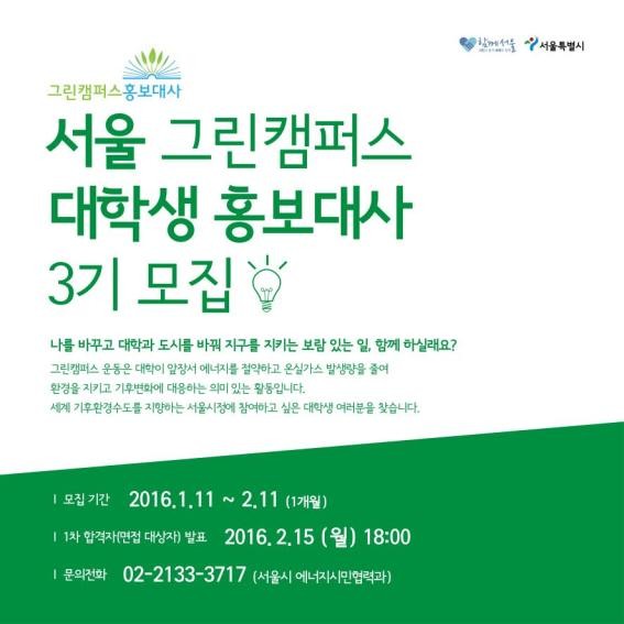 서울시는 젊음과 열정으로 그린캠퍼스를 만들어갈 대학생 홍보대사 50명을 2월 11일까지 모집한다고 밝혔다.