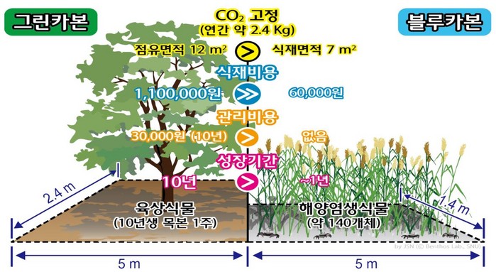 관리비용측면에서는 육상은 10년간 3만 원이 들지만, 블루카본은 제로, 식재비용은 육상은 110만원이지만, 해양갯벌은 6만 원, 점유면적도 그린카본 12m2 필요하고, 블루카본 갯벌은 7m2면 충분하다. 이처럼 그린카본과 블루카본은 이산화탄소(CO2) 연간 약 2.4kg을 기존으로 비교한 수치라고 공개했다.