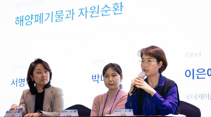 3세션에서는 '해양폐기물과 자원순환' 주제로 모더레이터는 서명지 CSR임팩트 대표를 포문을 열고, 연사는 허정림 건국대 사회환경공학부 교수, 박나영 넥스파 선임연구원, 이은해 롯데케미칼 수석이 참석했다.