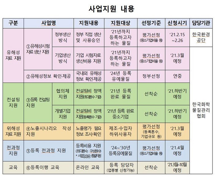 세부 사업내용, 신청일정 및 필요서류 등은 산업계도움센터 (www.chemnavi.or.kr) 또는 화학물질 등록지원 시스템(sbm.kcma.or.kr)에서 확인할 수 있다.