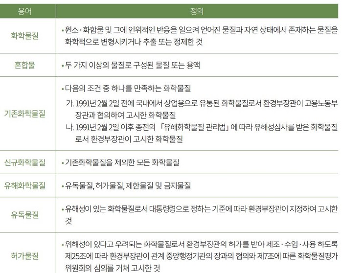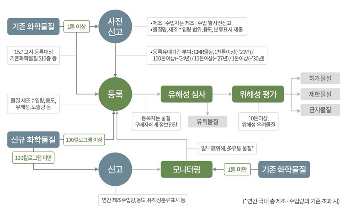 일명 '화평법'(화학물질의 등록 및 평가 등에 관한 법률에 따라 기존화학물질을 연간 1톤 이상으로 제조·수입하려는 사업자는 제조·수입량에 따라 협의체를 구성 취급하는 화학물질을 2030년까지 단계적으로 공동등록해야 한다.