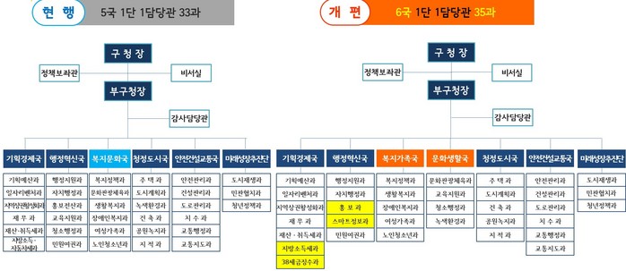 과 단위 개편은 행정혁신국 내 기존의 홍보전산과를 홍보과와 스마트정보과로 개편해 업무의 전문성을 강화한다. 홍보전담부서인 홍보과를 신설해 구의 주요 시책과 역점사업 등을 체계적으로 홍보하고, 주민과의 소통을 기반으로 한 홍보를 강화해 구정에 대한 주민의 참여와 이해도를 높일 계획이다.