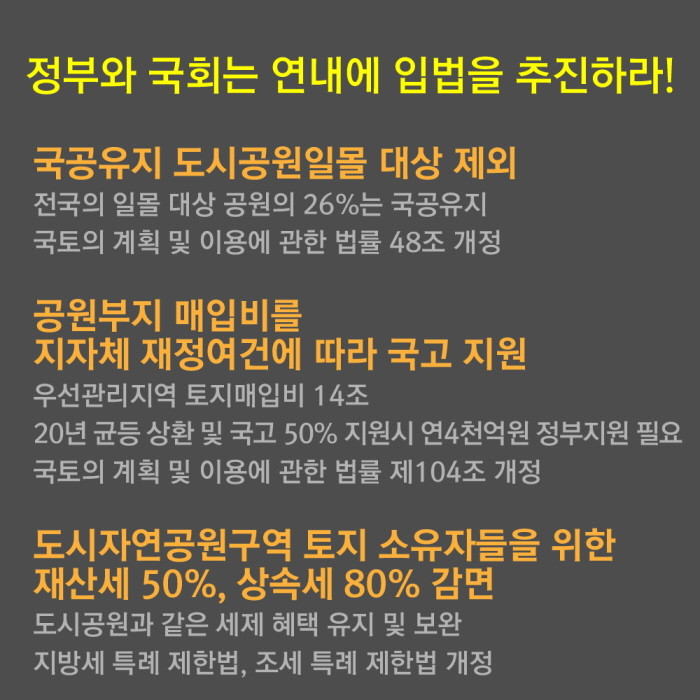 또한 도시공원 내 부지로 돼 있는 국공유지 공원부지는 지정 효력을 10년간 연장(실효 유예)하고, 향후 관리실태 등을 고려해 10년 범위에서 그 효력을 추가로 연장할 수 있도록 세부항목을 신설했다.