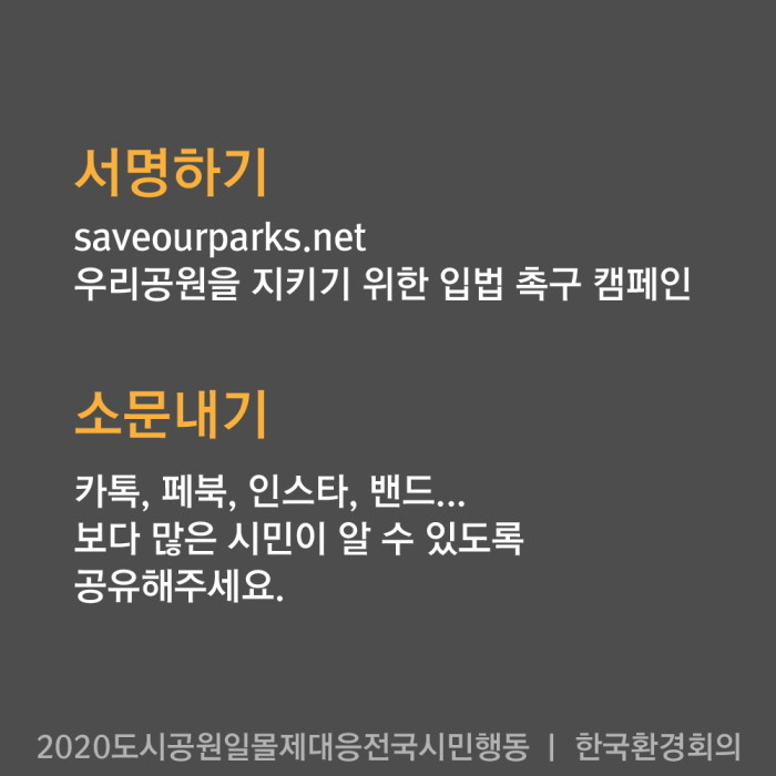 현재 환경운동연합, 생명의숲,아름다운재단, 2020도시공원일몰제대응전국시민행동은 범국민차원에서 우리 집 앞 작은공원지키기 위한 서명운동을 펴고 있다. 직접 서명하기는 www.saveourparks.net