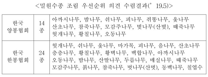 김문섭 국립산림과학원 임업연구사는 "아까시나무 밀원수로 70~80% 차지하지만, 기후변화에 흉년과 풍년을 오고가는데, 과학적인 접근성과 토지 생산성측면에서 대체 밀원으로 다양한 종을 심어야 한다."고 주장했다.