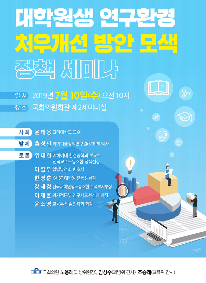 과학기술정보방송통신위원회 김성수의원, 노웅래위원장, 교육위원회 조승래 의원이 공동주최하는 '대학원생 연구환경 처우개선 방안 모색' 정책세미나가 10일 10시, 국회의원회관 제2세미나실에서 진행된다.