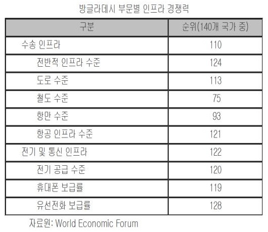 World Economic Forum이 발표한 글로벌경쟁력 보고서(Global Competitiveness Report) 2015/16에 따르면, 방글라데시는 조사대상 140개국 중 107위에 머물렀으며, 수송 인프라를 포함한 인프라 경쟁력은 123위로 최하위권을 기록했다. 수송인프라 경쟁력은 110위, 전기통신 인프라 경쟁력은 122위로 각각 나타났다.