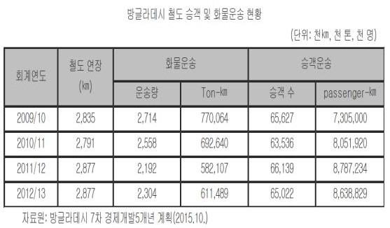 철도 및 내륙수로 확대 및 운송 능력 확대에 고심하는 방글라데시다. 방글라데시 정부의 재정 부족과 장기적인 개발계획의 부재로 방글라데시 철도 부문은 1972년 파키스탄으로부터의 독립 이후 성장이 정체돼 있다.