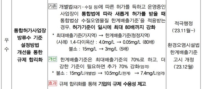 첫 번째 우수사례로 선정된 '통합허가사업장 방류수 기준 설정방법 개선'은 개별법에 따라 허가를 받아 운영 중인 사업장이 '환경오염시설의 통합관리 법률'에 따라 수질오염물질 한계배출기준을 적용받게 되는 경우 배출 기준이 대폭 강화돼 기준 준수 부담이 컸으나, 기존 배출기준의 70%로 한계배출기준을 설정하도록 규정이 합리적으로 개선됐다.