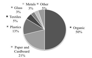 전체 쓰레기 배출량 중 음식물 쓰레기가 포함된 유기물 쓰레기의 비율은 50%에 달한다.