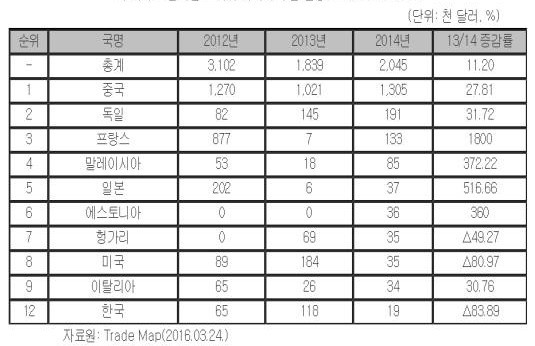 이런 가운데 2014년 한국산 음식물 쓰레기 처리기 수입액은 1만9000달러로 전체 수입액의 1%를 차지했다. 전체 비용에 비하면 한국산 음식물 처리기 수출이 상당히 유리할 수 있다.