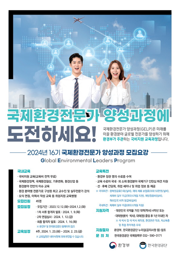 K-eco 한국환경공단은 '2024년 국제환경전문가 양성과정' 교육생을 12일부터 ’24년 1월 2일까지 모집한다.