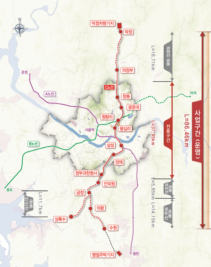 수원역에서 출발해 인덕원역, 삼성역·청량리역(서울), 의정부역 등을 거쳐 덕정역(양주)에 이르는 수도권광역급행철도 C노선(GTX-C)이 착공됐다.