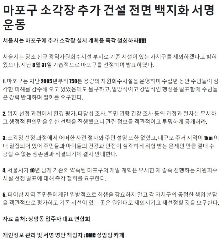 특히 마포 주부들의 모임 맘카페에서 소각장 건립에 강력한 반대 입장을 펴고 상암동 아이들 엄마들과 연대한 서울시에 다른 대안이 있는데 굳이 추가로 고통을 주는지 시장을 향해 단체행동을 할 것이라고 의견이 모아지고 있다.