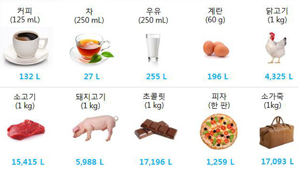 실제로 1 kg의 쇠고기를 생산하기 위해서는 1만5000ℓ의 물이 쓰여진다. 커피 한 잔을 만들기 위해서는 200ℓ의 물 필요는 애교를 봐줄만 하다. 발렌타인데이를 지나 화이트데이때 날개 돋치듯 팔리는 초콜릿은 200g의 달콤함 대신 최대 3500ℓ이 물이 사용된다고 밝혔다.