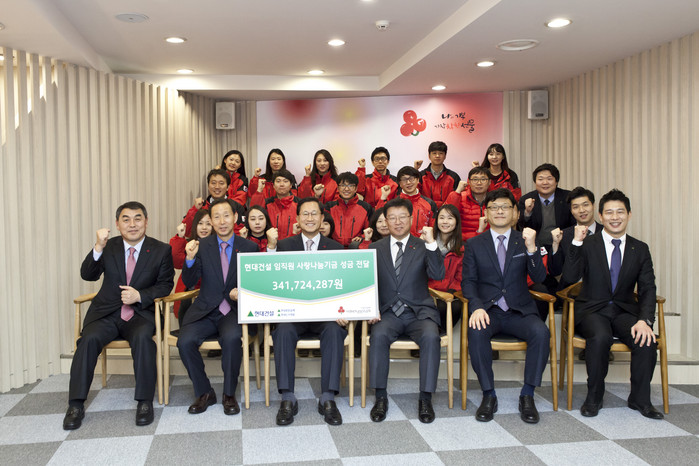 현대건설은 16일 서울 중구 정동 소재 사회복지공동모금회 대회의실에서 현대건설 정희찬 상무, 임동진 노조위원장 및 현대종합설계 등 계열사 관계자와 사회복지공동모금회 김주현 사무총장 등이 참석한 가운데 성금 전달식을 가졌다.