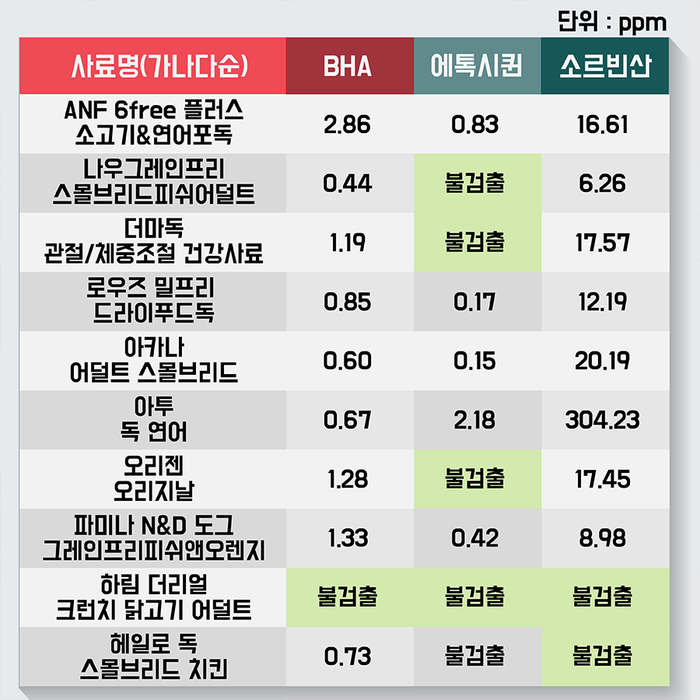 사료 속에 들어가 있는 성분 중 BHA, 에톡시퀸, 소르빈산 세 가지 모두 검출되지 않은 사료는 하림더리얼크런치닭고