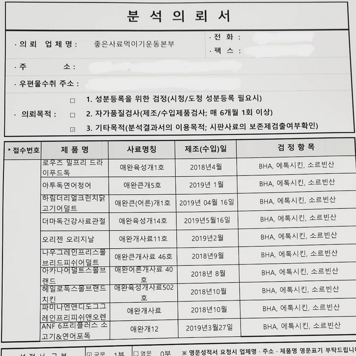 하지만 합성보존제가 유해, 무해하다는 판단의 근거는 그 어떠한 사료회사도 제시하지 않았다. 사료회사들은 법정기준치를 지켰다는 입장만을 밝혔다. 이에 반려가족들은 제시한 자료들을 우리가 먼저 알아야 한다고 판단해 우리 스스로가 직접 조사를 의뢰하기로 결정했다.