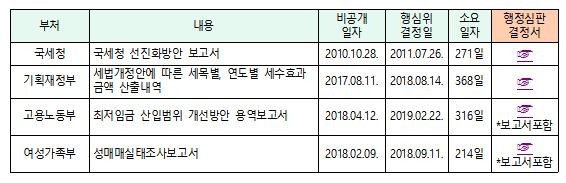 납세자연맹은 연맹이 정부를 상대로 정보공개를 청구한 후 비공개결정이 내려져 행정심판위원회에서 '정보를 공개하라'는 결정을 받아낸 대표적인 사례로 ▲고용노동부의 '최저임금 산입범위 개선방안 보고서' ▲여성가족부의 '성매매실태조사보고서' ▲국세청의 '국세청 선진화방안 보고서' 등을 꼽았다.