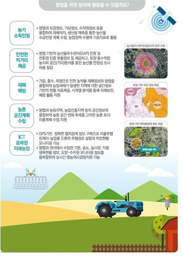 팜맵 기반의 농업활동 지원정보를 활용하거나, 타 공공데이터(공공데이터포털, 공간정보(국가공간정보포털 http://www.nsdi.go.kr) 등의 자료와 융합 분석·활용 가능하다.