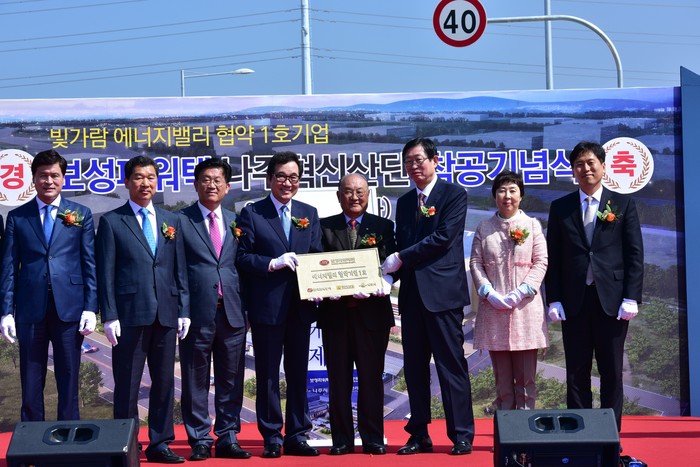 이날 착공식에는 사진 오른쪽부터 손금주 국회의원 당선인, 임수경 한전 KDN 사장, 조환익 한전 사장, 임도수 보성파워텍 사장, 이낙연 전남도지사, 강인규 나주시장, 신정훈 현 국회의원을 비롯 한전 계열사, 시공사, 협력사 등 나주시 주민 등이 참석했다.