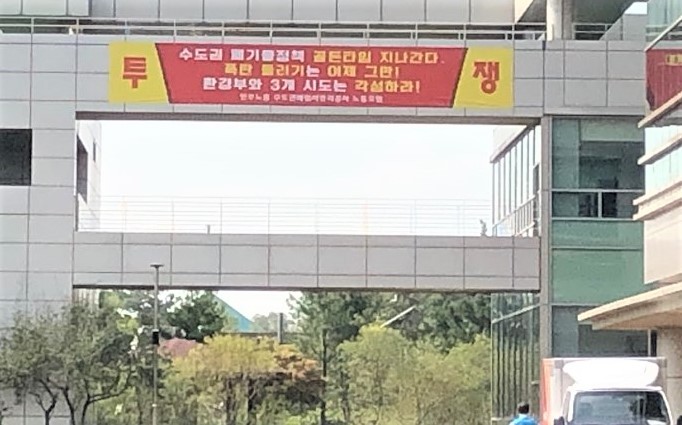 | ▲수도권 폐기물 정책에 대한 골든타임이 지났다. 더 이상 폭탄 돌리기는 이제 그만이라며 환경부와 인천시, 경기도, 서울시는 각성하라는 현수막에 수도권매립지관리공사에 내걸려 있다. |