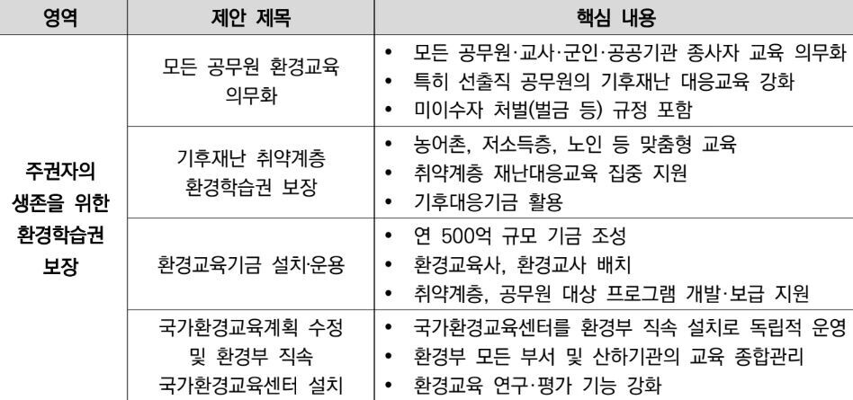공무원과 공공기관 직원 등이 환경 소양을 갖추고 기후위기 문제해결 역량을 함양해 산불, 홍수, 폭염 등의 기후재난으로부터 국민의 생명과 안전을 지켜낼 수 있도록 환경교육 의무화 방안도 추진한다.