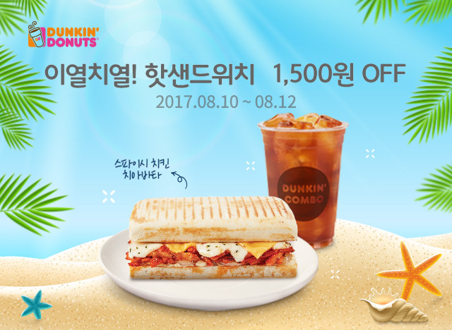 [환경데일리 유혜리 기자]던킨도너츠가 말복을 맞아 10일부터 12일까지 3일간 '핫 샌드위치 프로모션'을 실시한다. 행사 기간 중 치킨이 들어간 '핫치킨 샌드위치 콤보' 2종에 대해 1500원 할인 혜택을 제공하는 행사다.