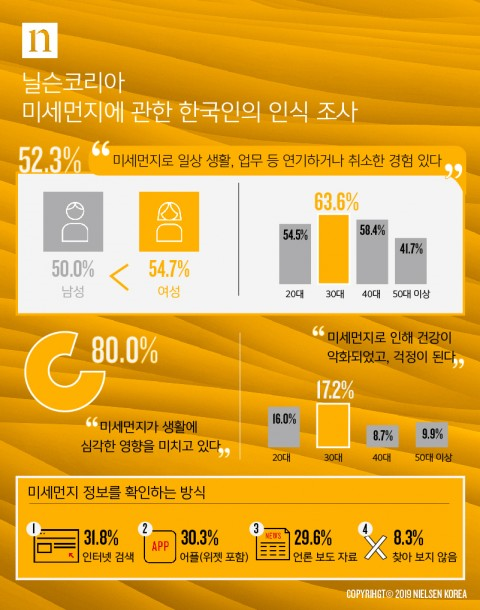 닐슨코리아가 진행한 '미세먼지에 관한 한국인의 인식 조사' 결과 한국인 10명 중 8명(80.0%)은 미세먼지가 생활에 심각한 영향을 미치고 있다고 응답했으며, 응답자의 과반수 이상(52.3%)이 미세먼지로 인해 일상생활, 업무 등의 활동을 연기하거나 취소한 경험이 있는 것으로 나타났다.