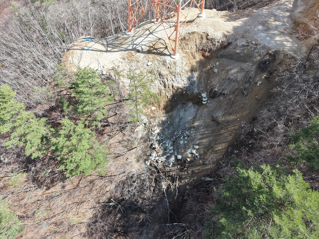 송전탑 부지 조성 과정에서 능선부 산지를 과도하게 절취하면서 발생한 토사와 암석이 급경사 사면과 계곡 방향으로 유출된 상태다. 봉화 지역 훼손지는 대부분 계곡 하류에 주민 주택이 위치하고 있어, 집중호우 시 토석류가 발생할 경우 직접적인 피해가 우려된다.