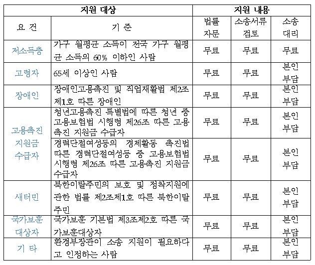 법률자문과 소송서류 검토 서비스는 저소득층, 노약자, 장애인 등 사회 취약계층에게 모두 무료로 지원하며, 소송비용 또는 변호사보수 지원은 저소득층에 한해 지원한다.