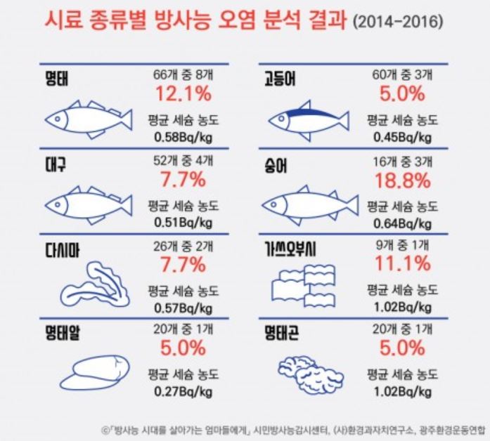환경운동연합 시민방사능감시센터 최경숙씨는 "지금도 꾸준하게 방사능 오염물질이 생선류에서 나오고 있고, 올해 설날 차례상에 올라온 명태류에서 부터 돔배기, 고사리, 북한산 중국산 표고버섯 등에서 검출되고 있다."고 말했다.