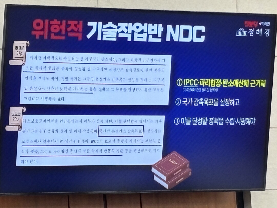 진보당은 국가 감축 목표(MDC) 산정 과정과 기술 작업반의 역할 문제를 삼았다.