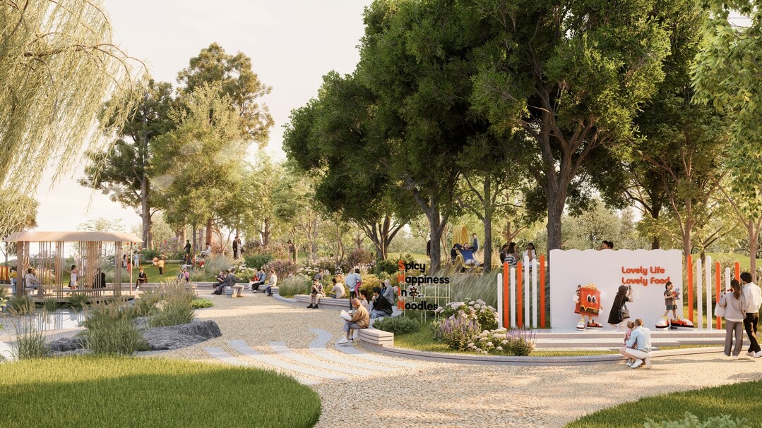 기업 로고와 신라면을 상징하는 빨간색, 브랜드 캐릭터를 정원 동선에 조화롭게 배치했다. 꼬불꼬불한 라면 면발의 형태와 라면이 끓을 때 생기는 물의 기포 등, 신라면이 완성되는 과정을 시각적으로 재해석해 조형물에 담아낼 계획이다.