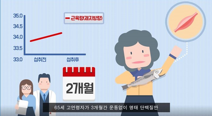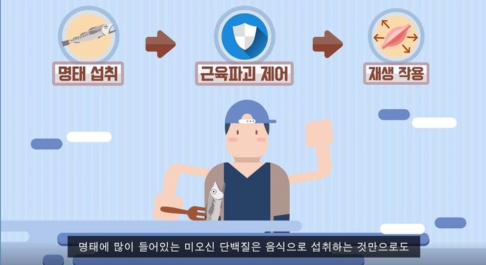 한국원양산업협회는 사람과 실험용 쥐를 대상으로 한 이들 대학교 연구진들의 연구 결과를 에니메이션 화면을 통해 상세히 소개하고,'명태 단백질이 함유하고 있는 유효 성분을 탐구한 결과 미오신 성분이 근육량을 증가시키는 것으로 확인됐다'며 다이어트 식재료로서 명태의 장점을 적극 홍보하고 있다.
