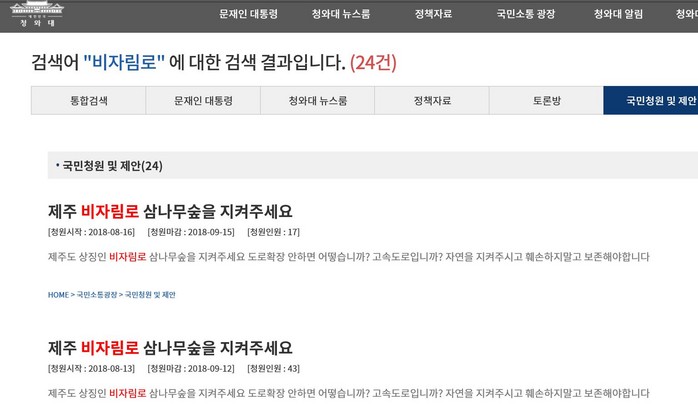 현재 지난 8일부터 시작된 청와대 국민청원에는 며칠도 안 돼 15,000명을 넘겼다. 비자림로 보호해달라고 청원만 무려 24건으로 기록적인 결과를 낳고 있다. 제주도민과 육지의 국민들은 천혜의 자연, 사람과 자연이 공존하는 제주도가 더 이상 환경보호 지키려는 의지를 토건세력이 자리를 내주고 자신들 스스로 타락한 섬으로 추락시키고 있다며 전국적인 조롱을 받고 있다.