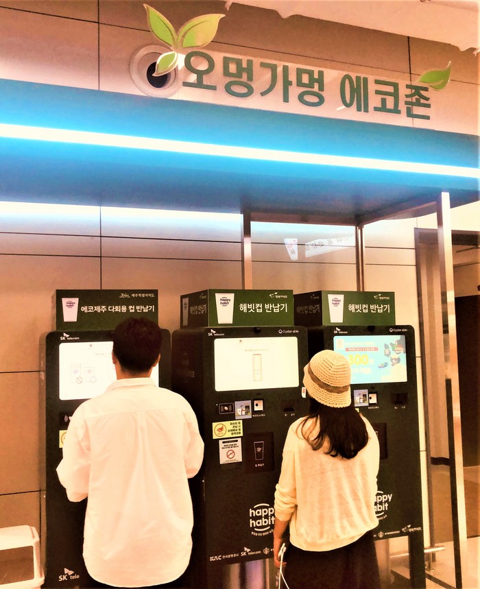 ▲제주국제공항에는 다회용기컵 회수기가 비치돼 관광객들이 공항을 떠나기 전에 사용한 컵을 회수기에 반납하고 있다. 이 기기는 제주특별자치도, 스타벅스코리아, SK가 지속가능한 ESG경영 차원에서 지원하고 있다. |