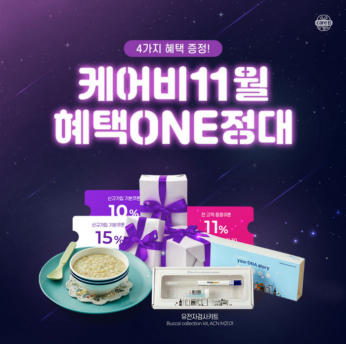또한 케어비의 특장점인 '유전자 영양맞춤 이유식' 식단 서비스 이용을 위한 유전자 검사 키트를 1+1에 제공하고 있다. 이벤트 기간 중 검사 키트를 구매하는 고객에게 30% 할인 쿠폰을 추가로 증정한다. 이외에도 11월 이벤트 기간 동안 참여자 전원에게 100% 혜택을 제공하는 '소문내기' 이벤트를 진행하며, 신규 회원 고객들을 위한 이유식 무료체험 혜택, 할인 쿠폰 등 다양한 혜택을 함께 제공한다.