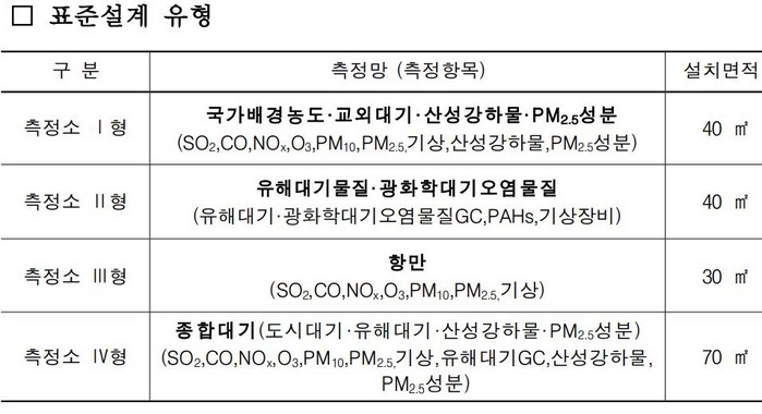 설계표준은 대기환경을 측정하는 항목과 측정장비 종류에 따른 특성에 맞춰 적합한 측정소 면적과 측정기 배치 등을 감안 4가지 유형으로 맞춤형 설계를 적용했다.