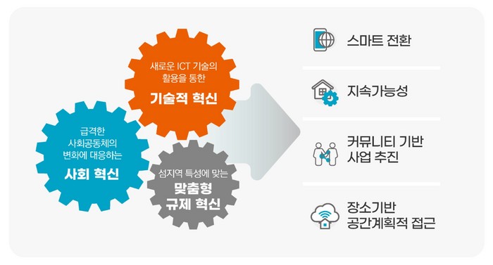 이를 실현하기 위해서는 새로운 ICT 기술의 활용을 통한 기술적 혁신과 섬 지역 특성에 맞는 맞춤형 규제 혁신, 급격한 사회공동체의 변화에 대응하는 사회 혁신 등 3가지 요소가 필요할 것으로 보인다.