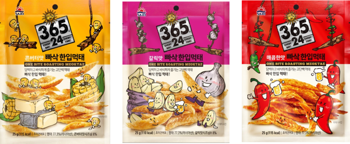 365일, 24시간 매일 먹어도 질리지 않고 언제 어디서나 맛있게 즐길 수 있는 사조대림의 스낵/안주 브랜드인 '365.24'로 선보이는 '빠삭 한입먹태'는 콘버터맛과 갈릭맛, 매콤한맛 세가지 맛으로 출시된다.