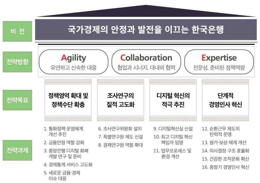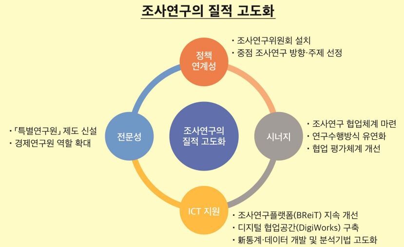 내부적으로 고위급 조사연구위 설치해 조사연구 체계를 부서 중심에서 전행 차원으로 전환하겠다고 특별연구원 제도를 신설, 주요 부서에 배치하고 경제연구원의 역할을 확대해 ICT・디지털 혁신을 활용한 조사연구 지원시스템도 구축을 제시했다.