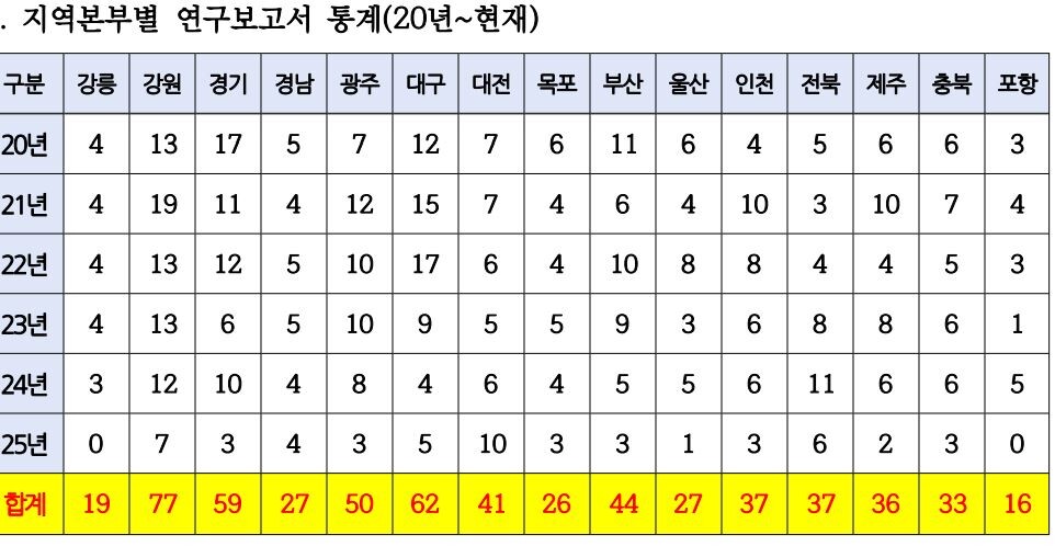 이는 다른 지역본부와도 대비된다. 같은 기간 전북본부는 농축산·신재생에너지·관광 분야에서 29건, 대전세종충남본부는 첨단산업 및 세종시 경제효과 분석 등 27건의 보고서를 발간하며 지역 현안에 선제적으로 대응했다.