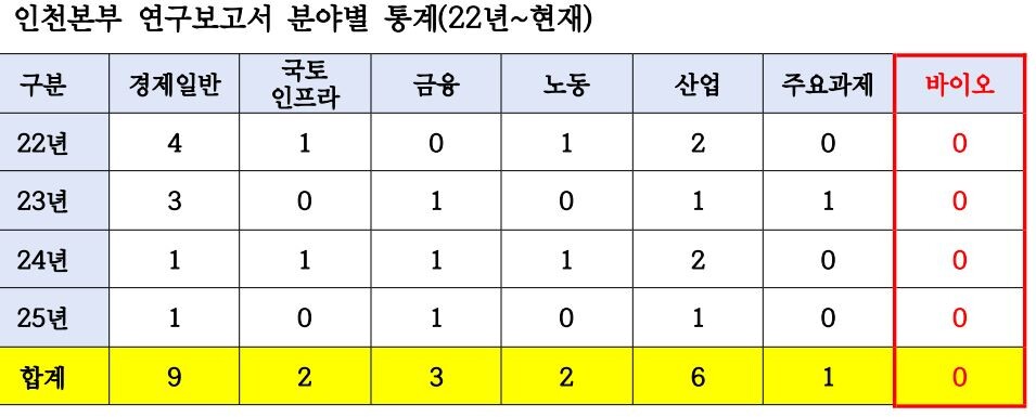 한국은행 지역본부는 각 지역의 경제 현황을 조사·연구하고 산업 동향을 분석해 안정적인 지역경제 성장을 뒷받침하는 법적·제도적 책무를 지고 있다. 그러나 한국은행 자료에 따르면, 인천본부는 2022~25년 8월까지 발표한 총 23건의 조사·연구 보고서 중 대부분을 물류·항만 등 전통 산업에 집중했고, 바이오 관련 보고서는 전무했다.