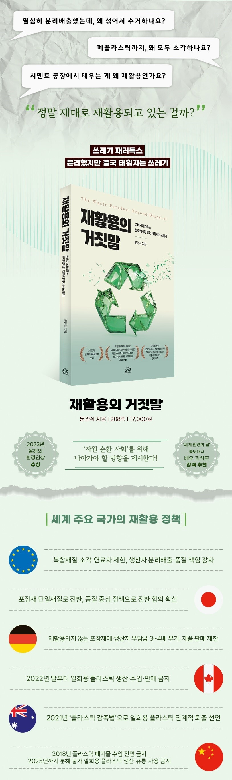이 부분에 대해 저자는 "화려한 착시"라고 꼬집었다. 실제로 한국의 폐기물 재활용률은 소각이나 연료화까지 포함돼 계산되며, 유럽·일본 기준으로 다시 계산하면 실제 물질 재활용률은 20% 남짓에 불과하다.